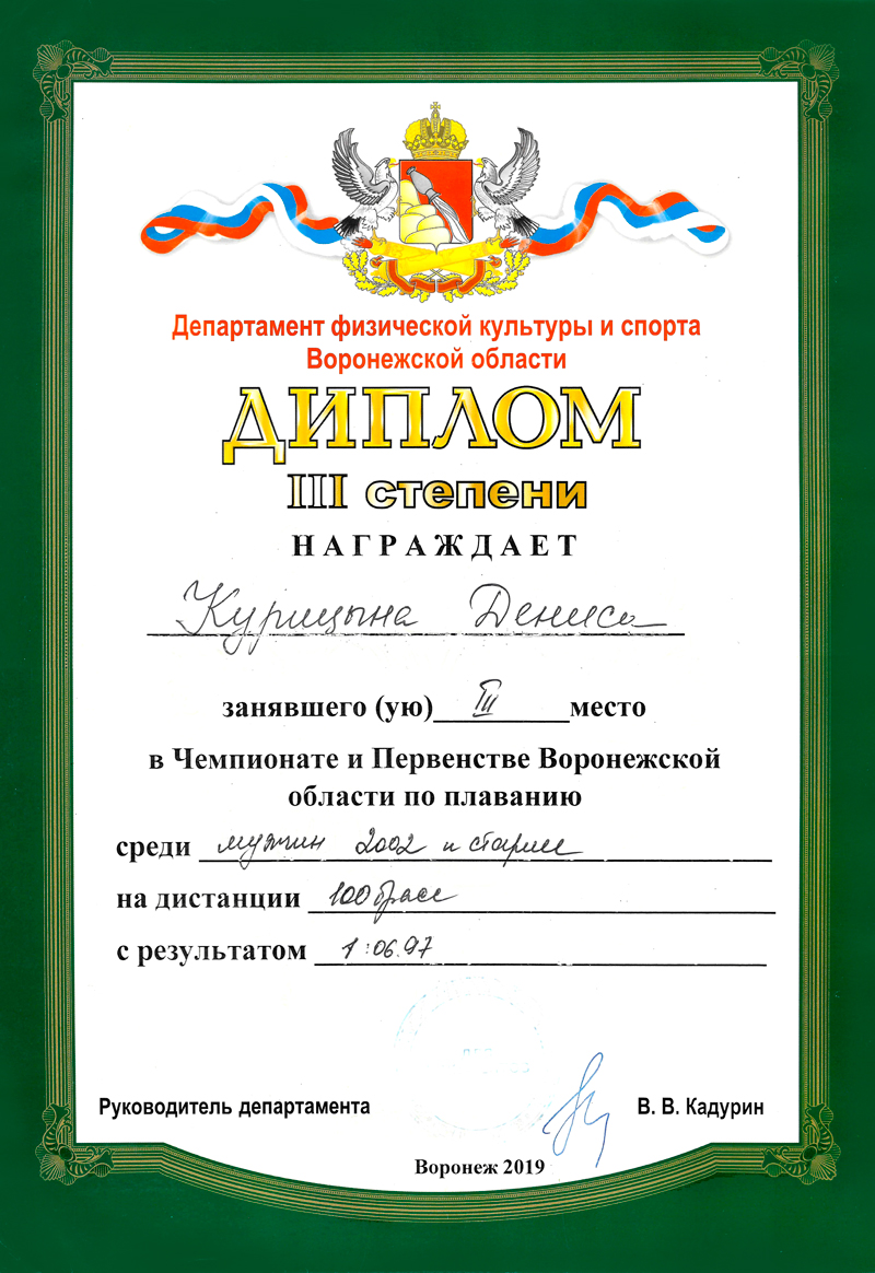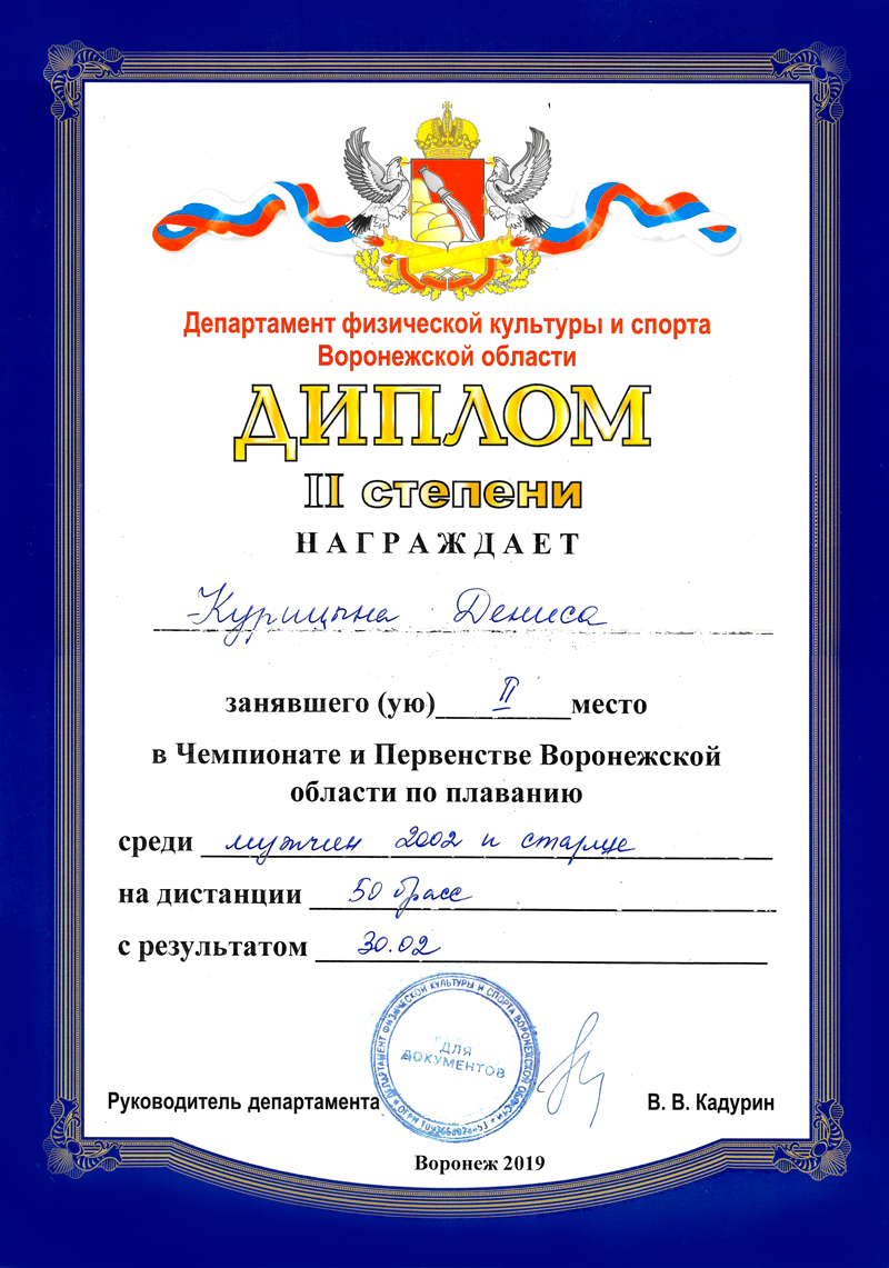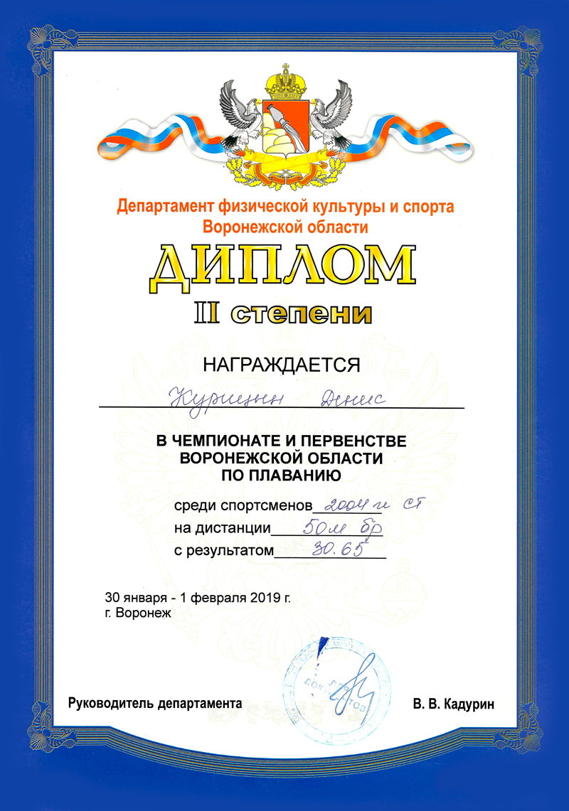 Мастер спорта России по плаванию. Неоднократный победитель и рекордсмен Воронежской области. Призер Чемпионатов и Первенств ЦФО. Участник Чемпионатов и Кубков России по плаванию.